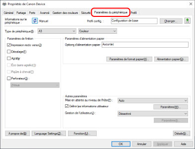 Si [Informations sur le périphérique] est défini sur [Auto], les informations relatives au périphérique sont acquises et les informations sur les fonctions et les options de ce dernier sont automatiquement configurées.