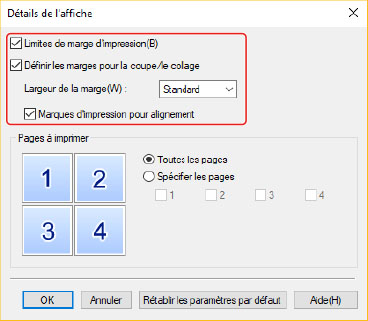 Boîte de dialogue [Détails de l'affiche] : [Limites de marge d'impression], [Définir les marges pour la coupe/le collage] et [Marques d'impression pour alignement]