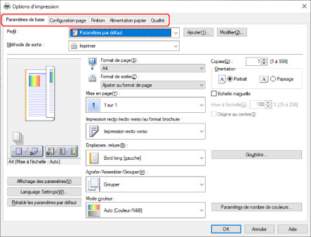 REMARQUESi la fonction que vous souhaitez utiliser ne s'affiche pas dans l'écran des paramètres d'impression, configurez les paramètres d'impression après avoir activé les fonctions du périphérique, en récupérant les informations sur le périphérique, etc.