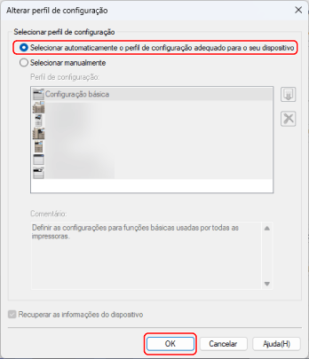 Selecione [Selecionar automaticamente o perfil de configuração adequado para o seu dispositivo] → clique em [OK].