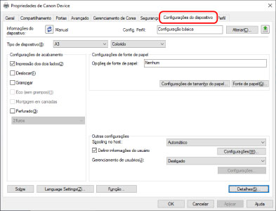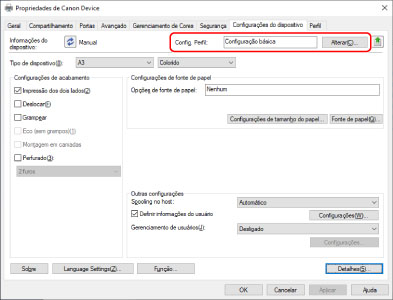 IMPORTANTESe você não tiver selecionado um perfil de configuração adequado para o dispositivo que está usando, as informações no dispositivo poderão não ser corretamente aplicadas e algumas das funções do dispositivo não poderão ser utilizadas. Selecione um perfil de configuração adequado para exibir as configurações necessárias na folha [Configurações do dispositivo]. As configurações não exibidas na folha [Configurações do dispositivo] não tiveram as informações do dispositivo adquiridas aplicadas a elas.