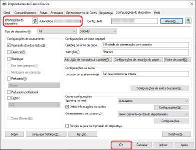 Normalmente, ao instalar, as informações do dispositivo são adquiridas e o perfil de configuração, a função do dispositivo e as informações de opção são definidos automaticamente. De acordo com o seguinte procedimento, verifique se o perfil de configuração que corresponde ao modelo da impressora foi aplicado e se [Informações do dispositivo] está definido como [Automático].