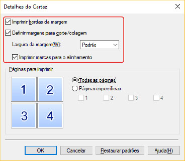 Caixa de diálogo [Detalhes do Cartaz]: [Imprimir bordas da margem], [Definir margens para corte/colagem] e [Imprimir marcas para o alinhamento]
