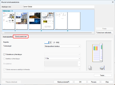 Voit muuttaa tiedoston tulostusasetuksia käyttämällä Canon PageComposeria.