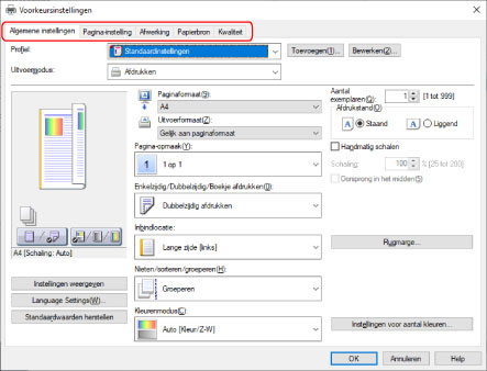 Stel de vereiste items in het afdrukinstellingsscherm van het stuurprogramma in.