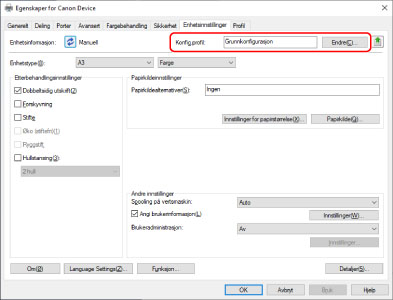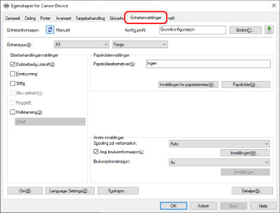 VIKTIGHvis du ikke har valgt en konfigurasjonsprofil som passer til enheten du bruker, kan det forekomme at enhetsinformasjonen ikke brukes korrekt, og at noen av enhetens funksjoner ikke kan brukes. Velg en egnet konfigurasjonsprofil for å vise de nødvendige innstillingene i [Enhetsinnstillinger]-arket. Innstillinger som ikke vises i [Enhetsinnstillinger]-arket har ikke fått angitt den innhentede enhetsinformasjonen.