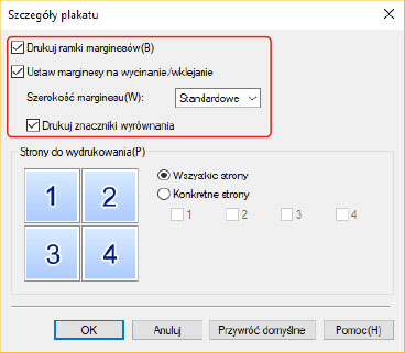 Okno dialogowe [Szczegóły plakatu]: [Drukuj ramki marginesów], [Ustaw marginesy na wycinanie/wklejanie] i [Drukuj znaczniki wyrównania]