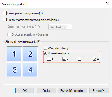 Okno dialogowe [Szczegóły plakatu] > [Strony do wydrukowania] > [Konkretne strony]: [2] i [4]