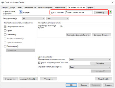 Во время установки автоматически задается профиль конфигурации, соответствующий модели принтера. Если устройство подключено по USB, функция получения информации об устройстве может не поддерживаться в зависимости от устройства, драйвера или среды. С помощью приведенной ниже процедуры убедитесь в том, что применен профиль конфигурации, соответствующий модели принтера, и задайте информацию о функциях и дополнительных модулях устройства вручную.