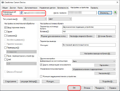 Обычно при выполнении установки происходит получение информации об устройстве, и профиль конфигурации, а также информация о функциях и дополнительных модулях устройства задаются автоматически. С помощью приведенной ниже процедуры убедитесь в том, что применен профиль конфигурации, соответствующий модели принтера, и что для параметра [Информация об устройстве] задано значение [Авто].