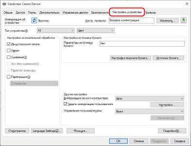 Прежде всего выберите профиль конфигурации, соответствующий модели принтера, на листе [Настройки устройства]. На листе [Настройки устройства] отображаются настройки для использования функций устройства. Далее задайте информацию о функциях и дополнительных модулях устройства. Если можно использовать функцию получения информации об устройстве, информацию о функциях и дополнительных модулях устройства можно задать автоматически.