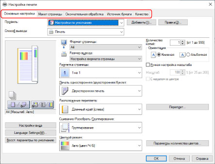 ПРИМЕЧАНИЕЕсли функция, которую Вы хотите использовать, не отображается на экране настроек печати, настройте параметры печати после включения функций устройства путем извлечения информации об устройстве и т.п.