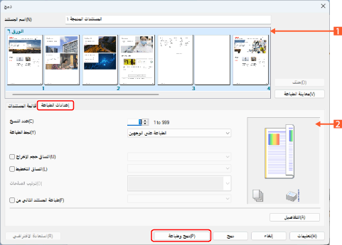 يمكنك دمج ملفات متعددة في ملف واحد وطباعته. يمكنك تغيير إعدادات الطباعة لتحرير الملف الناتج عن دمج الملفات باستخدام Canon PageComposer.