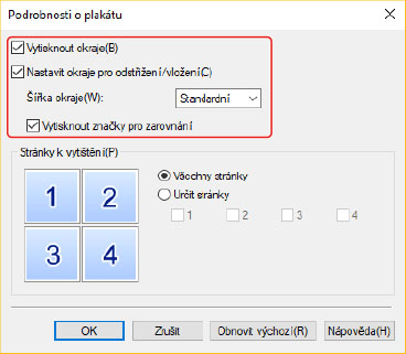 Dialogové okno [Podrobnosti o plakátu]: [Vytisknout okraje], [Nastavit okraje pro odstřižení/vložení] a [Vytisknout značky pro zarovnání]