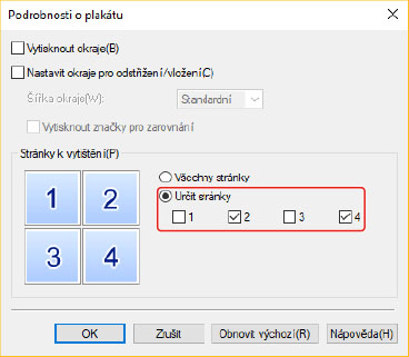 Dialogové okno [Podrobnosti o plakátu] > [Stránky k vytištění] > [Určit stránky]: [2] a [4]
