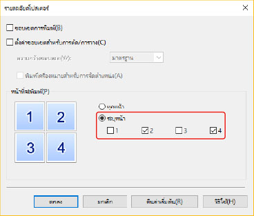 กล่องโต้ตอบ [รายละเอียดโปสเตอร์] > [หน้าที่จะพิมพ์] > [ระบุหน้า]: [2] และ [4]