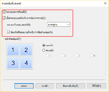เมื่อพิมพ์โดยมีเส้นขอบ หรือเมื่อตั้งค่าขอบหรือช่วงของหน้าที่จะพิมพ์ ให้ปฏิบัติตามขั้นตอนต่อไปนี้