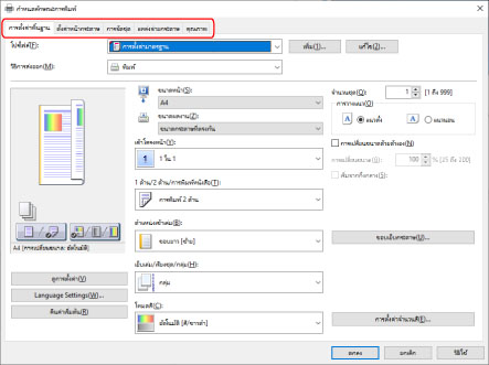 หมายเหตุหากฟังก์ชั่นที่ต้องการใช้ไม่แสดงในหน้าจอตั้งค่าการพิมพ์ ให้กำหนดค่าการตั้งค่าการพิมพ์หลังเปิดใช้งานฟังก์ชั่นของอุปกรณ์โดยเรียกใช้ข้อมูลอุปกรณ์ ฯลฯ
