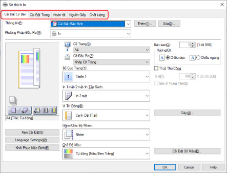 LƯU ÝNếu chức năng mà bạn muốn sử dụng không được hiển thị trên màn hình cài đặt in, cấu hình các cài đặt in sau khi bật các tính năng của thiết bị bằng cách lấy thông tin thiết bị, v.v...