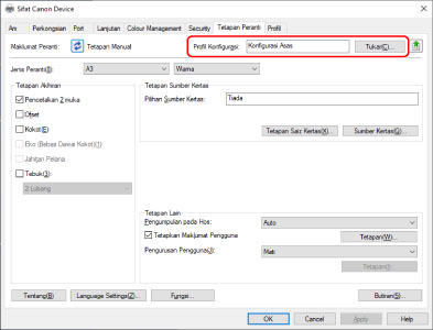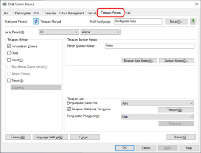 PENTINGJika anda belum memilih profil konfigurasi yang sesuai untuk peranti yang anda gunakan, maklumat peranti mungkin tidak digunakan dengan betul dan beberapa fungsi peranti mungkin tidak boleh digunakan. Pilih profil konfigurasi yang sesuai ntuk memaparkan tetapan yang diperlukan dalam helaian [Tetapan Peranti]. Tetapan yang tidak dipaparkan dalam helaian [Tetapan Peranti] tidak mempunyai maklumat peranti yang diperlukan digunakan padanya.