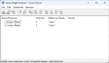 Dalam skrin utama Canon PageComposer, pilih fail yang pratonton cetakannya ingin anda semak daripada senarai → klik [