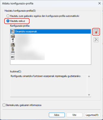 GARRANTZITSUAEz baduzu aukeratzen gailurako egokia den konfigurazio-profila, baliteke gailuko zenbait funtzio erabilgarri ez egotea.