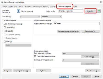 Bistaratu inprimagailuaren ezarpenen pantaila.