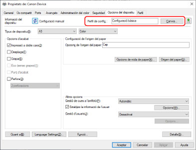 Durant la instal·lació, el perfil de configuració corresponent al model d'impressora es defineix automàticament. La funció d'obtenció d'informació del dispositiu pot no estar disponible quan el dispositiu es connecta mitjançant USB, en funció del dispositiu, el controlador o l'entorn. D'acord amb el procediment següent, comproveu que s'ha aplicat el perfil de configuració que s'ajusta al model d'impressora i definiu la funció del dispositiu i la informació d'opcions de forma manual.