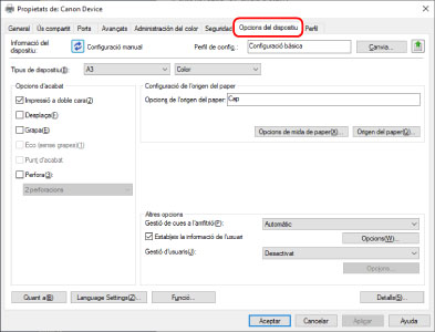 IMPORTANTSi no heu seleccionat un perfil de configuració adequat per al dispositiu que esteu utilitzant, és possible que la informació del dispositiu no s'apliqui correctament i que algunes de les funcions del dispositiu no es puguin utilitzar. Seleccioneu un perfil de configuració adequat per visualitzar les opcions necessàries al full [Opcions del dispositiu]. Quant a les opcions que no es visualitzin al full [Opcions del dispositiu], no s'hi haurà aplicat la informació del dispositiu obtinguda.
