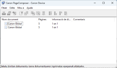 A la pantalla principal de Canon PageComposer, seleccioneu el fitxer del qual voleu obtenir una vista prèvia d'impressió a la llista → feu clic a [