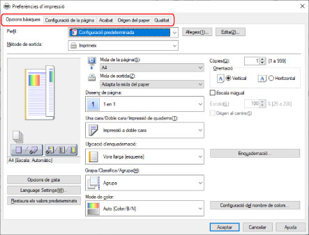NOTASi la funció que voleu utilitzar no apareix a la pantalla de configuració de la impressió, configureu les opcions d'impressió després d'activar les funcions del dispositiu obtenint la informació del dispositiu, etc.