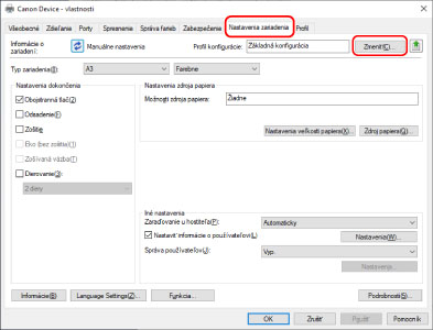 DÔLEŽITÉAk nie je vybratý profil konfigurácie vhodný pre používané zariadenie, niektoré funkcie zariadenia sa nemusia dať používať.