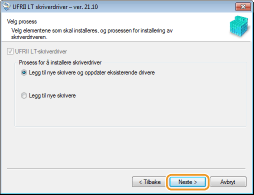 Hvis en skriverdriver allerede er installert, vises skjermbildet [Velg prosess] før skjermbildet [Velg skrivere som skal installeres]. Valget du tar her har ingen innvirkning på konfigurasjonsprosessen for skriveren. Klikk ganske enkelt på [Neste]. ![]() Hvis kategorien [IPv6-enheter] ikke vises