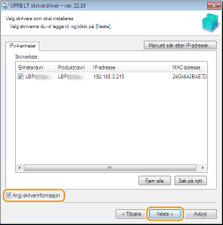 Velg avmerkingsboksen [Angi skriverinformasjon] og klikk så på [Neste].