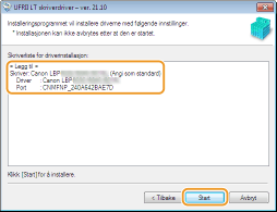 Sjekk skriverinformasjonen i [Skriverliste for driverinstallasjon] og klikk på [Start].