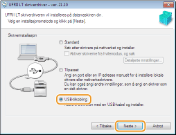 Når følgende skjermbilde vises, kobler du datamaskinen og skriveren sammen med en USB-kabel (Koble til via USB) og skrur skriveren PÅ.