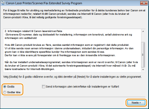 Hvis du velger [Godta], vil Product Extended Survey Program (et program for undersøkelse av maskinbruken) bli installert.