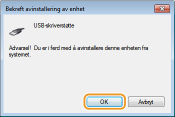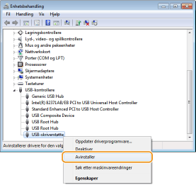 Slett USB-klassedriveren når det ikke er mulig å installere skriverdriveren på korrekt måte med en USB-tilkobling. Vær oppmerksom på at selv om du sletter USB-klassedriveren, vil den bli installert på nytt automatisk når du kobler skriveren og datamaskinen sammen med en USB-kabel.