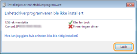 ![]() Hvis et automatisk oppsettsskjermbilde for Plug and Play, som vist nedenfor, vises når du kobler til USB-kabelen, klikker du på [Lukk] eller [Avbryt] for å lukke det.