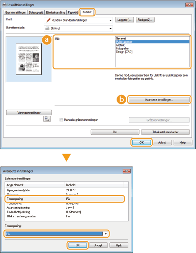 I skjermbildet [Avanserte innstillinger], kan du spesifisere forskjellige andre utskriftsinnstillinger enn [Tonersparing]-innstillinger. For mer informasjon om innstillingene, klikk på [Hjelp] på skjermbildet for skriverdriveren.