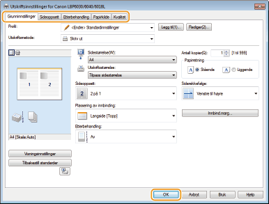 Endre innstillingene på skjermbildet for utskriftsinnstillinger, og klikk på [OK].