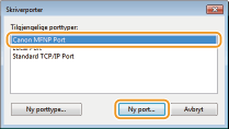 Velg [Canon MFNP Port] i [Tilgjengelige porttyper], og klikk på [Ny port].