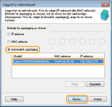 Velg [Automatisk oppdaging], velg maskinen når den er oppdaget, og klikk på [Neste].