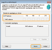 Klikk på [Oppdater]. Hvis problemet vedvarer, velg [IP-adresse] eller [MAC-adresse], angi-adressen eller MAC-adressen for maskinen (Vise nettverksinnstillinger) og klikk deretter på [Neste].