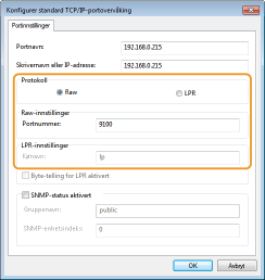 Under [Protokolltype], velg [RAW] eller [LPR], og endre [Portnummer].