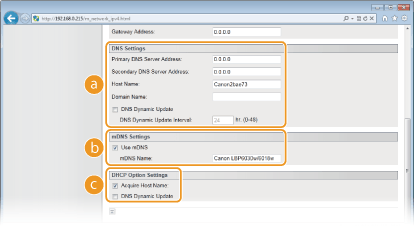 mDNS (multikast-DNS) brukes av Bonjour og er en protokoll for å knytte et vertsnavn til en IP-adresse uten bruk av DNS. Merk av i avmerkingsboksen hvis du vil aktivere mDNS, og angi mDNS-navnet i tekstboksen [mDNS Name]. Fjern merket i avmerkingsboksen hvis du ikke ønsker å bruke mDNS. [DHCP Option Settings][Acquire Host Name]