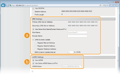 Velg avmerkingsboksen for å bruke de samme innstillingene som i IPv4. mDNS-navnet som brukes i IPv4 vil angis automatisk etter at maskinen startes på nytt. Fjern merket fra avmerkingsboksen og angi et navn i [mDNS Name] hvis du ønsker å bruke forskjellige innstillinger fra IPv4. |