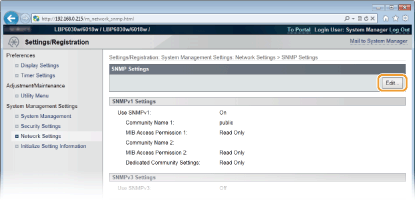 Simple Network Management Protocol (SNMP) er en protokoll for å overvåke og kontrollere kommunikasjonsenheter på et nettverk ved å bruke en Management Information Base (MIB)-database. Maskinen støtter SNMPv1 og SNMPv3 med forbedret sikkerhet. De lar deg kontrollere statusen for maskinen fra en datamaskin når du skriver ut dokumenter, eller du kan bruke Remote UI. Du kan aktivere SNMPv1 eller SNMPv3, eller begge deler samtidig. Angi innstillingene for hver versjon slik at de passer til nettverksmiljøet og bruksformålet.