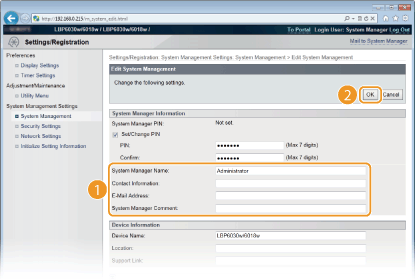 Angi navnet og kontaktinformasjonen til systemstyreren etter behov, og klikk på [OK].