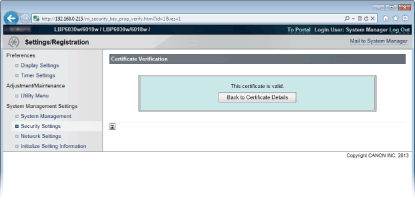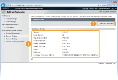 Kontroller sertifikatdetaljer, og klikk på [Certificate Verification].